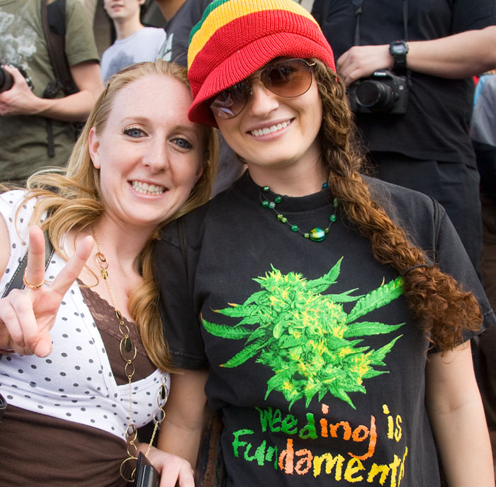 Great T-shirt on the right says MAKE AWKWARD SEXUAL ADVANCES, NOT WAR. Get high and meet chicks! Note Marley girl on left with her munchies in hand. Looks like the young lady second from left is making her own advances. Feelin Lucky! Couple of cuties there guys!