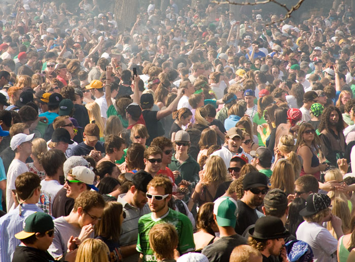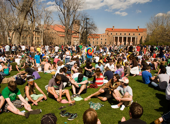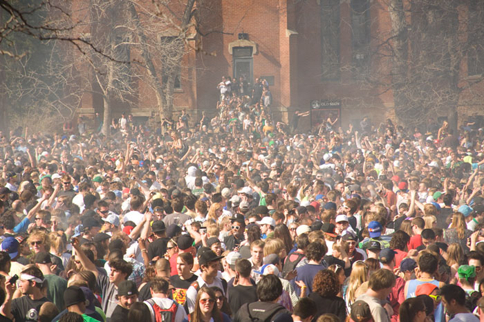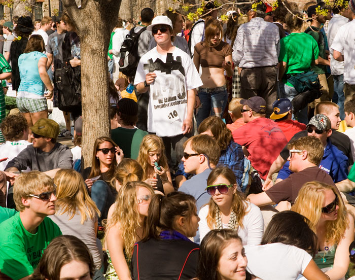 Annually, on 4/20, at 4:20 p.m. there is a “Smoke Out” on CU Boulder campus. This year’s crowd was certainly over 10,000. This was the scene at 3:30 PM. Most attendees were already well on their way to a parallel universe, but the big bang was still 50 minutes in the future.