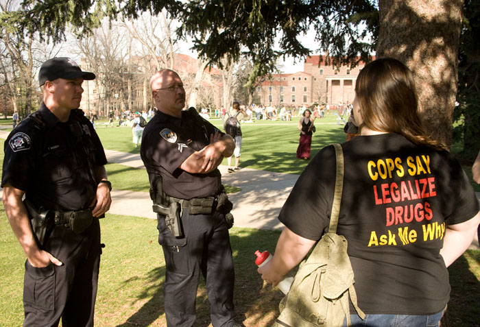 These cops were not impressed with this advocate for legalization. I would describe their demeanor as politely disgusted. The slogan meets reality.