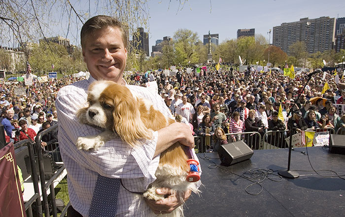 Here’s Mark Williams, chairman of The Tea Party Express with a shelter dog he found in Boston. He just had to show the crowd his new best friend.