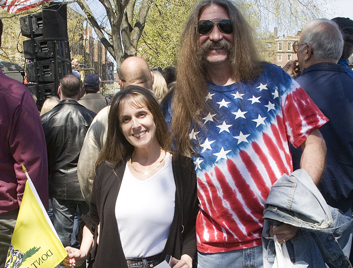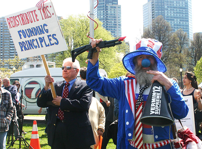 This photo sums up the gulf between the right and left in America. The man on the right is a committed leftist ideologue and anti-American activist. He was running helter skelter shouting “Ya got yer guns?” at the Tea Party crowd. I didn’t ask about Vermin 12 Supreme. Home planet maybe? Many of these crashers paraded around the press trucks seeking attention..