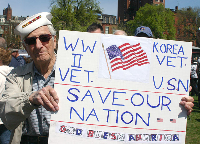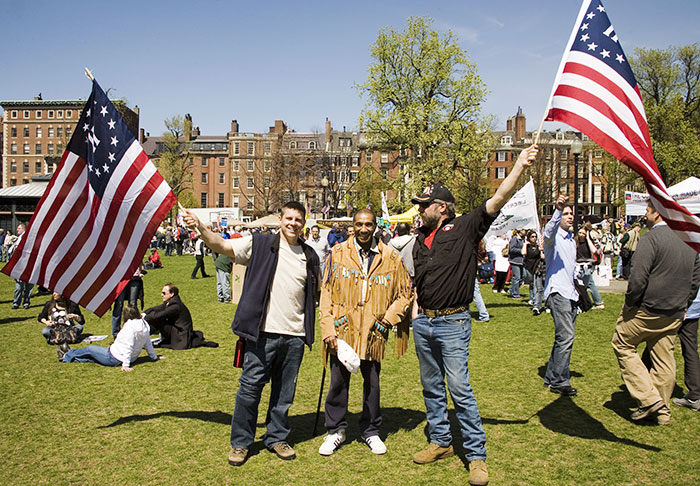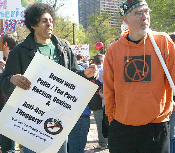 Timothy Eason, of Boston,(right) is the son of a “half Blackfoot indian, half black, WWII and Korean War veteran”. Mr. Eason said the reason he took a day off work to be at the Tea Party was “because it would have killed my father to see America being given away.”