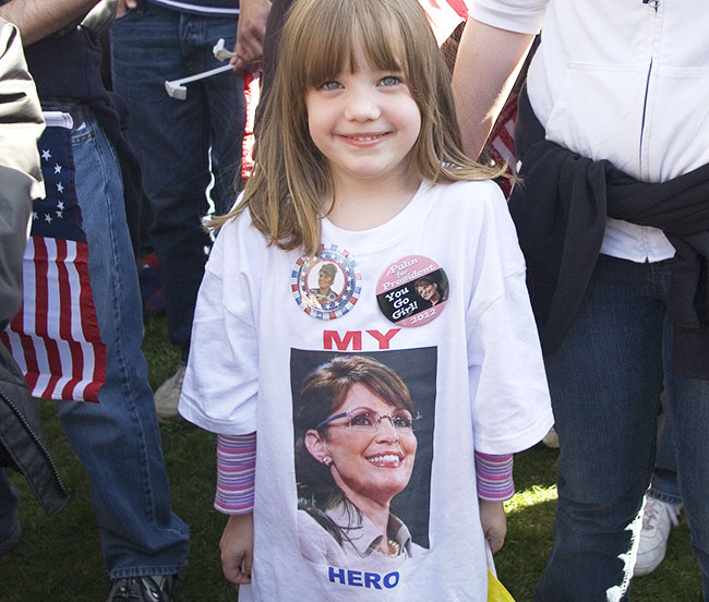 One small correction – it’s the Boston Common, not “Commons”. Love the picture of the little girl with the Palin T-shirt. For a bunch of violent racists, we sure had a lot of people with babes and puppies in the crowd.