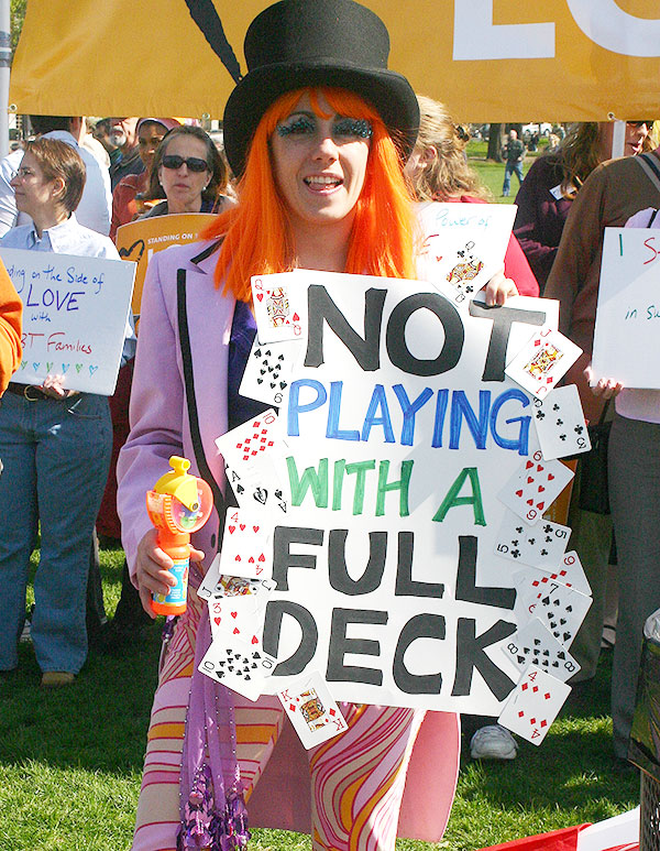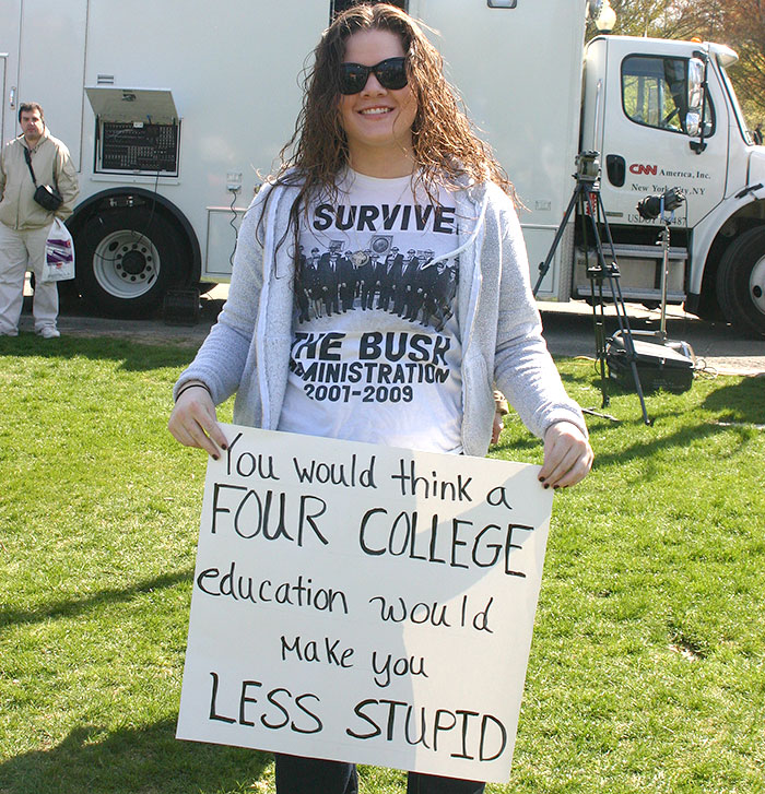 The sign on the right appears to be incoherent, but is another SNL derivative. The I’m gay for Palin sign says EVERYTHING SUCKS on the front. Studies consistently show that liberals are unhappy people when compared to conservatives. They also show that liberals consider themselves to be superior intellects. The photos in this essay confirm the former and expose the later as perhaps liberalism’s shallowest conceit.