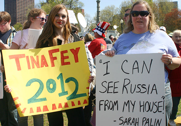 Case in point: There were several signs like the one on the right. This woman believed that was a real quote from Palin repeated by the comedienne Fey. It is actually a satirical reference to Palin’s inquisitional interview with Charles Gibson, when she stated that Russia can be seen from the continental US in Alaska. Alaska is home to NORAD and America’s largest National Guard contingent. Sarah Palin, as Governer of Alaska, was in charge of the Guard and was trying to emphasize their important role due to Alaska’s strategic location.