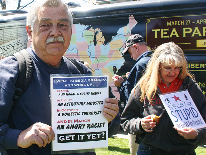 Grandpa has a brilliant sign detailing the short history of the lefts demonization of Tea Party supporters.
