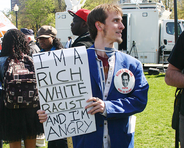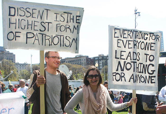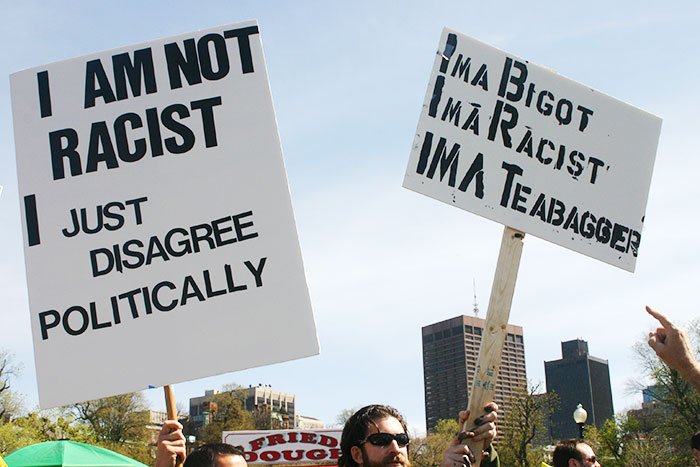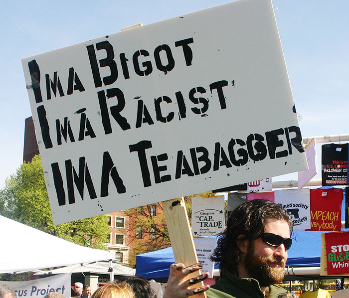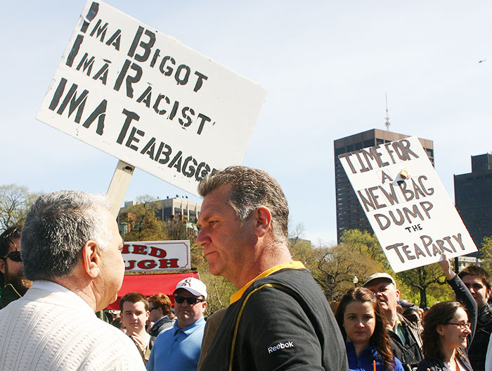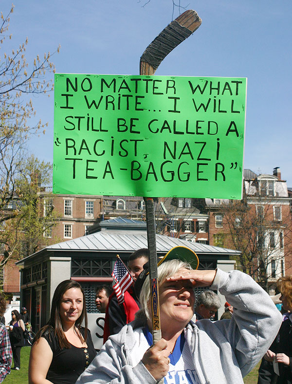 I have witnessed and reported on a number of Tea Party rallies over the last 14 months, and what happened at the Boston Commons was new and ugly. The levity with which the words Racist, Retard, Sexist, Homophobe and Fascist are displayed by liberals is astonishing. Jonah Goldberg recently wrote “dissent has gone from being the highest form of patriotism under George W. Bush to the most common form of racism under Barack Obama.”