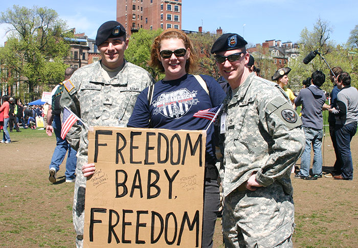 Soldiers Sparda and O’Rourke arrived too late to hear any of the speakers. Here they are with Susan Nunally from Manhattan, NYC. Sparda served twice in Camp Marc Lee in Iraq, and got a big hug when they met Marc’s mom, Debbie Lee.
