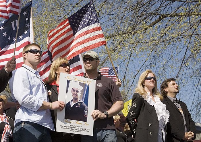 Debbie Lee is seen here with a photo of her son, Marc Alan Lee, the first Navy Seal killed in Iraq. Flanking her are two active duty Seals. There is an army base in Iraq named after Marc Lee, in honor of his valor. Mrs. Lee spoke to the crowd about her son, the Seals, and the importance of public understanding and support for the worldwide struggle against Islamic Jihadism.