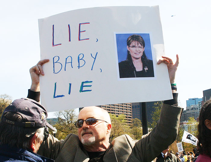 During the last presidential election, video interviews with Obama voters revealed that many were well versed in pop culture gossip about persons and events but unable to answer simple questions about civics or actual current affairs. Meanwhile the woman above remains convinced that the quote on her sign is really Palin’s. So many leftist myths are propagated by pop culture media that many people have no idea where reality stops and myth begins.