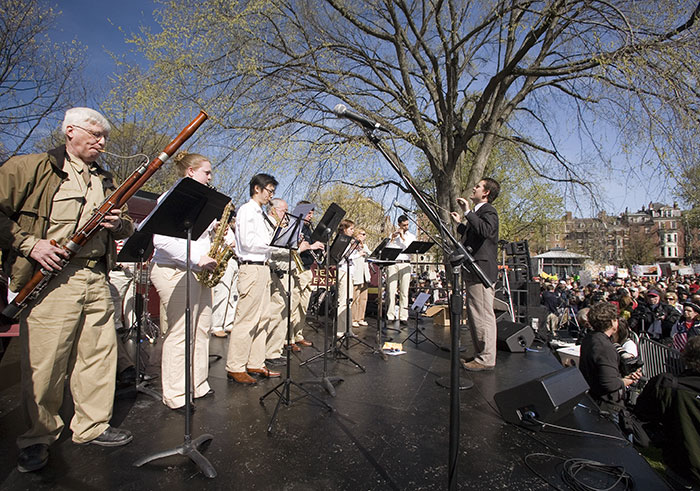 John Philip Sousa IV spoke to the Tea Party crowd. He is the great-grandson of American conductor, composer and patriot, John Philip Sousa. Sousa wrote The Stars and Stripes Forever!, which was played by this band. They also played the national anthem, and that is when I could first hear screaming and shouts from the leftists at the rear.