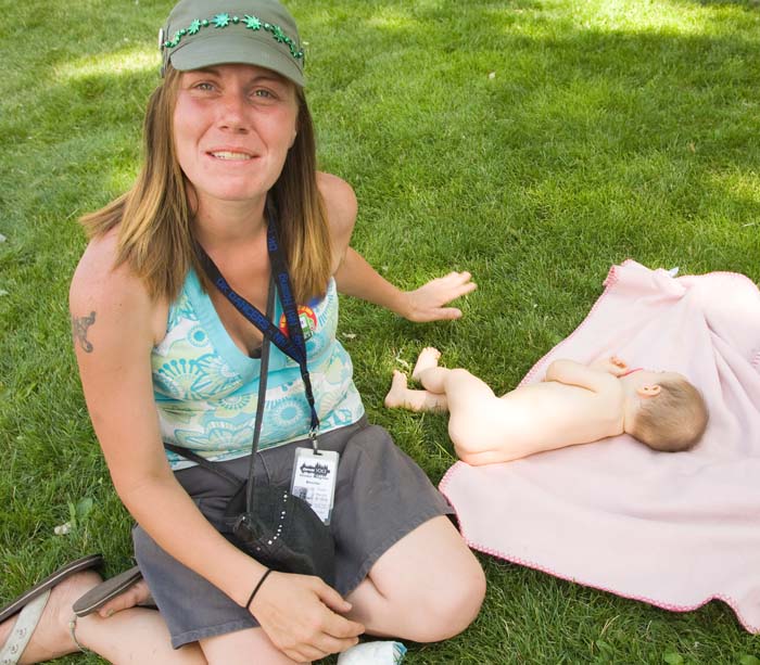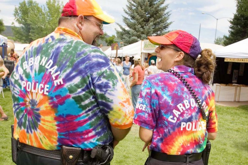 Every year at the Carbondale Mountain Fair cops look the other way as this party in the park goes on a bender. As we posed this photo, one of the “usual suspects” joined in. Glass of alcohol in hand and pants a drooping, my uninvited subject adds local color and sociological depth to this image.