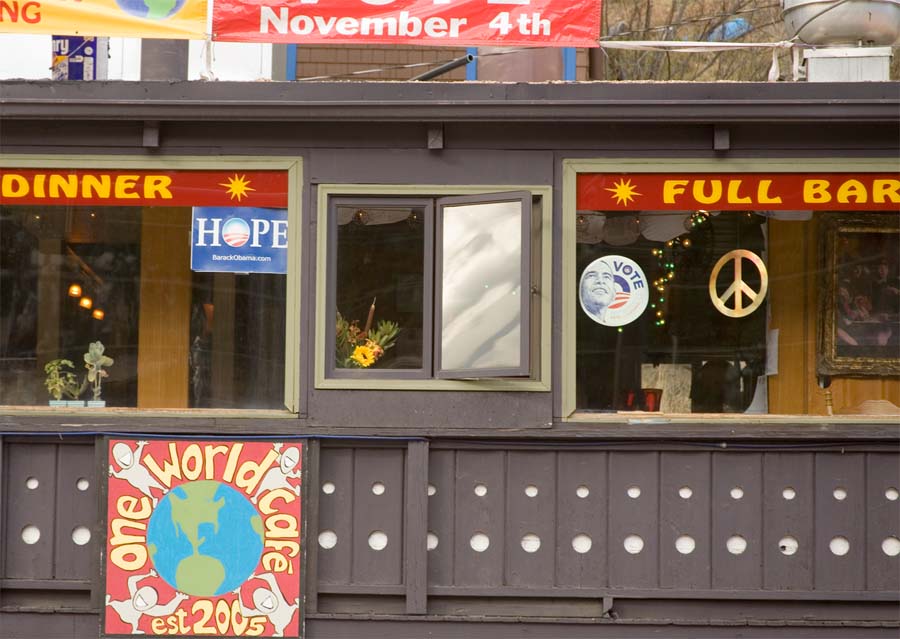 This is the upper floor of the One World Café in Evergreen. It appeared to be the unofficial Obama campaign headquarters. With a large VOTE NOVEMBER 4th banner on the roof and HOPE and CHANGE posters in the windows, lots of Obama/Biden signs and a peace symbol flag out front.