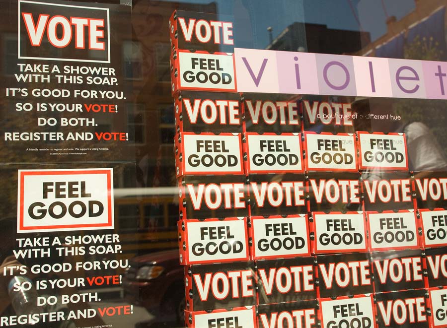 FEEL GOOD, IT’S GOOD FOR YOU, SHOWER AND VOTE… Democrat Party platform in Denver shop window. If it feels good, do it.