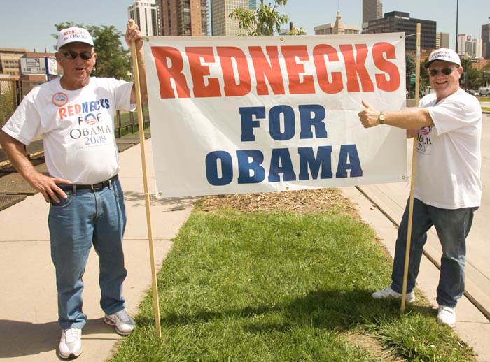 Barrack Obama’s nomination acceptance speech was held at Invesco Field, the Mile High Stadium in Denver. These ladies are “Special Guests” of the Democratic National Committee. “Look at my buttons! They’re hippy buttons, just like in the 1960’s!” said one of the gals. The buttons are stuck onto giant cloth purse/bag things.